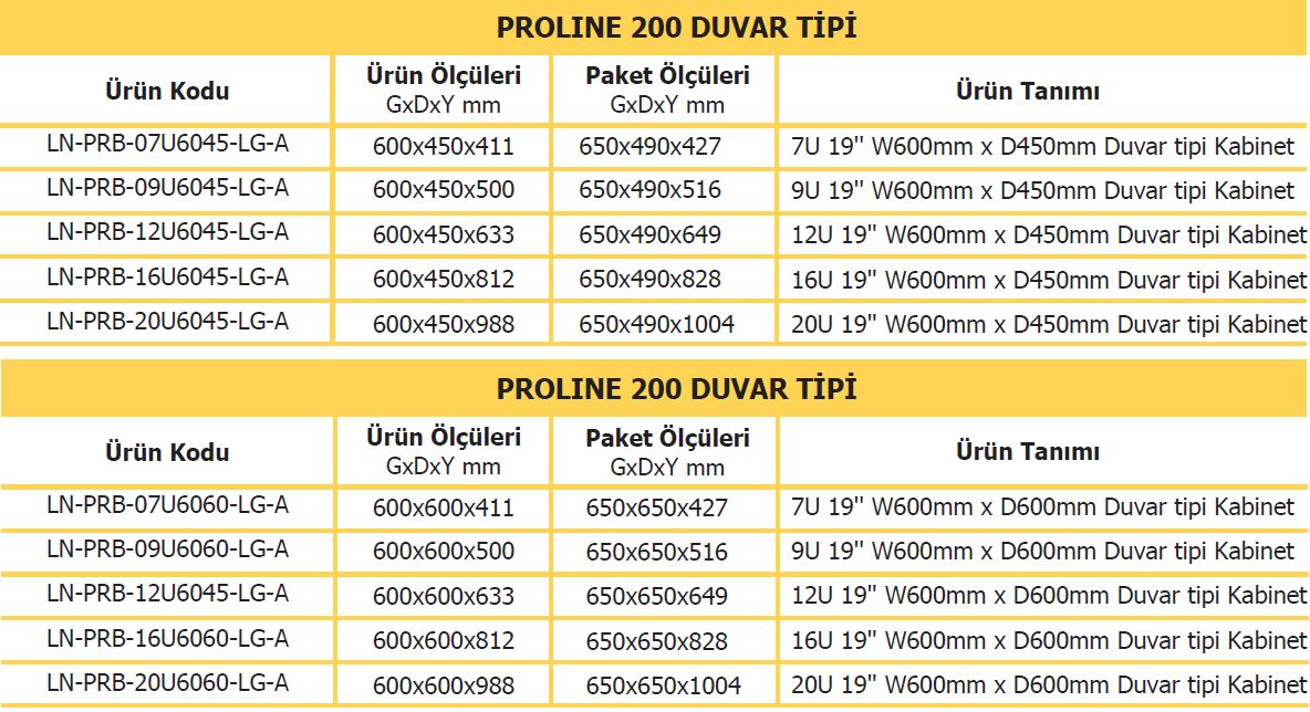 19” PROline 200 Serisi Duvar Tipi Kabinetler