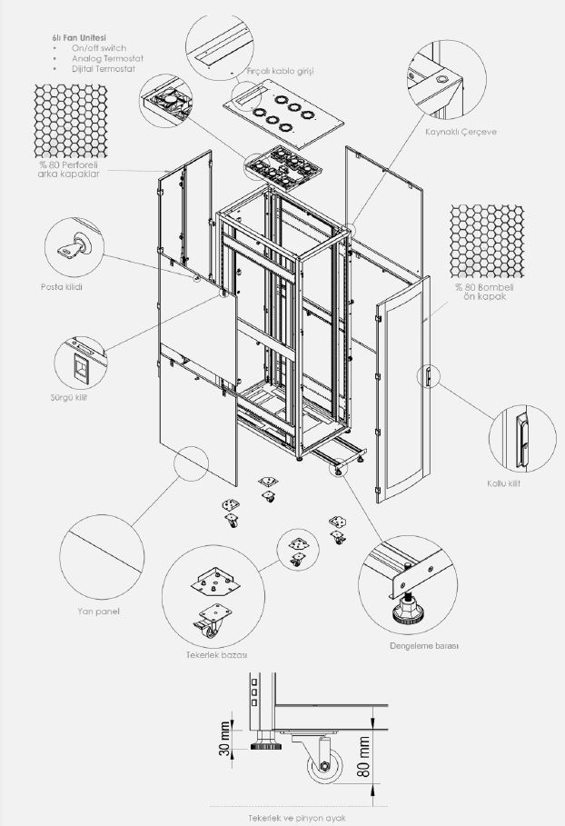 - Ön ve arka kapılarda 4 nokta menteşe uygulanmaktadır. Ayrıca tek kanat kapılarda 4, çift kanat kapılarda 3 noktadan kilitlenebilir yapısı ile üst düzey güvenlik sağlanmaktadır. 36U ve üstü kabinetlerde yan kapaklar yatayda 2 bölmeli ve kilitlenebilir olarak dizayn edilmiştir. Bu yapısı ile montaj esnasında kolayca sökülebilmesi ve taşınabilmesi amaçlanmaktadır.